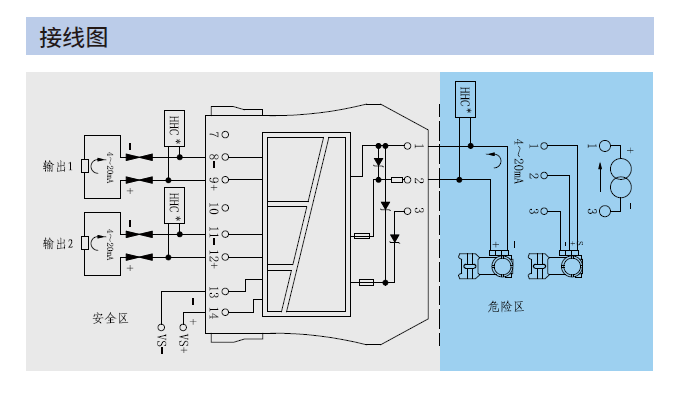 或电流源4~20mA信号,隔离传送到安全区两路输出,并支持HART信号双向通讯。变送器