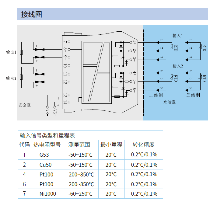 适用的现场设备 二线或三线热电阻G53、Cu50、Pt100、Pt1000、Ni1000