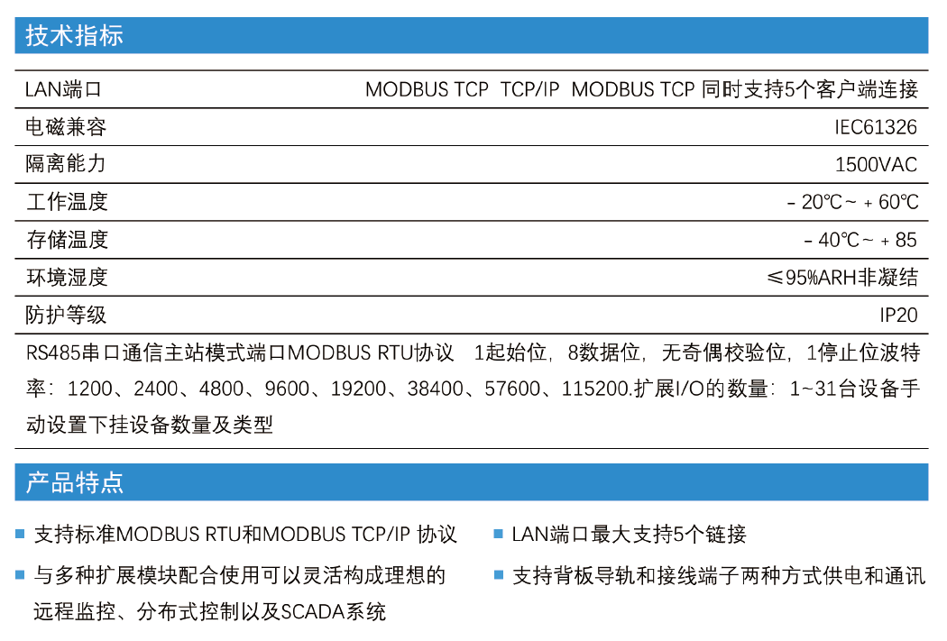 是一款结构紧凑DN导轨式安装的全隔离通讯控制器,它不但支持当今主流的 MODBUS RTU和 MODBUS TCP协议,而且可与多种扩展O 模块配合使用灵活构成高安全性和高可靠性的远程监控、分布式远程控制以及 SCADA系统。