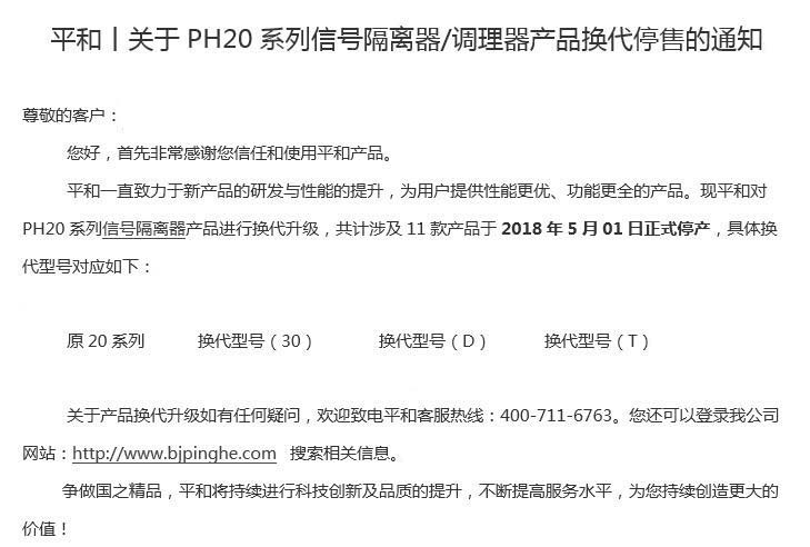 2018-04-16 信号隔离器,隔离器,安全栅平和丨关于PH20系列信号隔离器/调理器产品换代停售的通知
