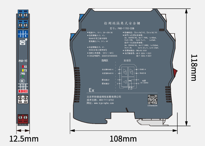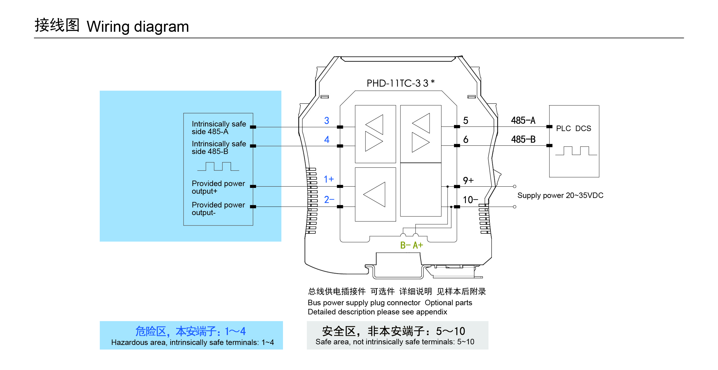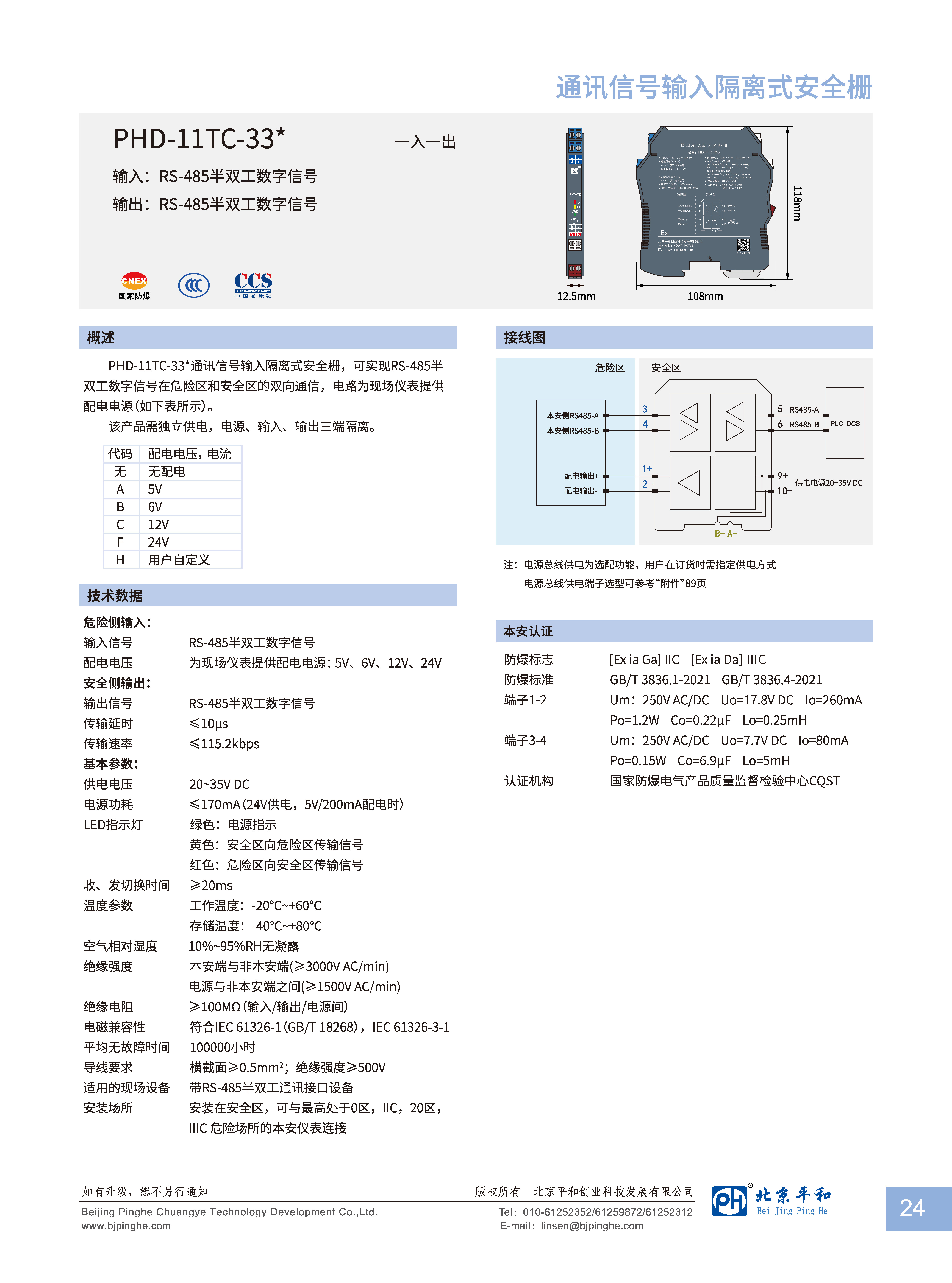 PHD-11TC-33*通讯信号输入隔离式安全栅,可实现RS-485半双工数字信号在危险区和安全区的双向通信。