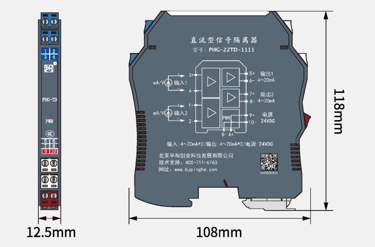 PHG-22TD系列模拟量输入信号隔离器,可实现将电流或电压信号经隔离、转换为电流或电压信号输出,输入、输出参数可根据用户需求定制。