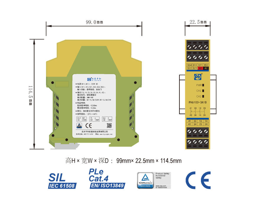 PH6101-3A1B是一款安全继电器控制模块,适用于急停按钮、安全门控制开关输入,具有3路常开(NO)安全输出触点和1路常闭(NC)辅助输出触点的安全继电器。它支持单、双通道操作,手动或自动复位,并具有通道间短路监控功能。