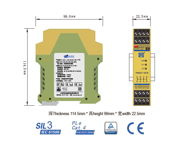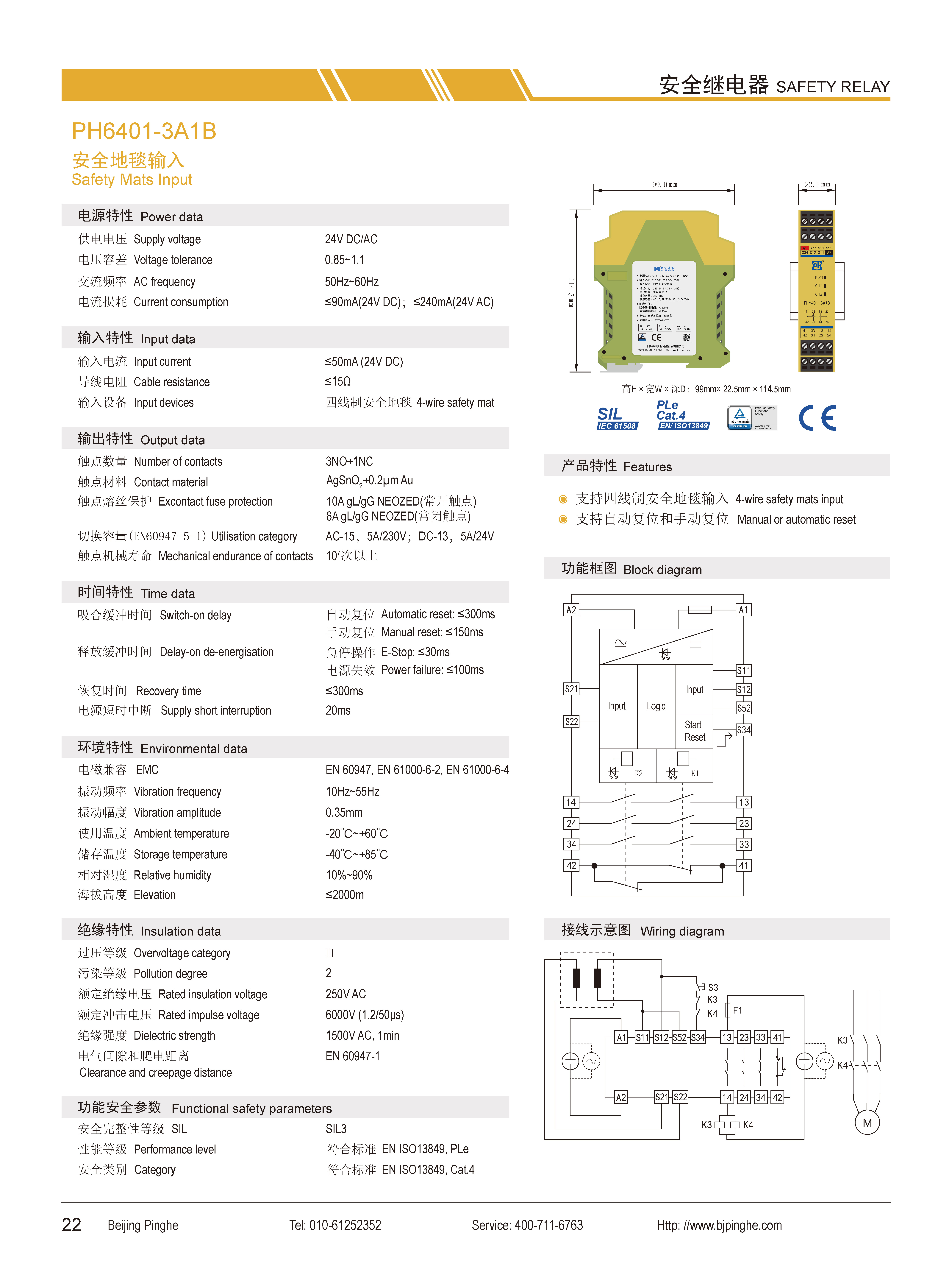 PH6401-3A1B是一款安全继电器控制模块,适用于安全地毯输入,具有3路常开(NO)安全输出触点和1路常闭(NC)辅助输出触点的安全继电器。它支持双通道操作,手动或自动复位功能。