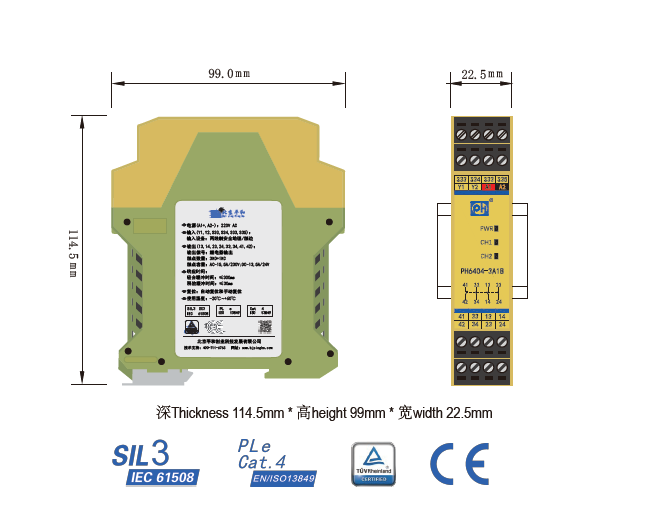 PH6404-3A1B是一款安全继电器控制模块,适用于两线制安全地毯输入,具有3路常开(NO)安全输出触点和1路常闭(NC)辅助输出触点的安全继电器。它支持手动或自动复位,并具有复位按钮监控功能。