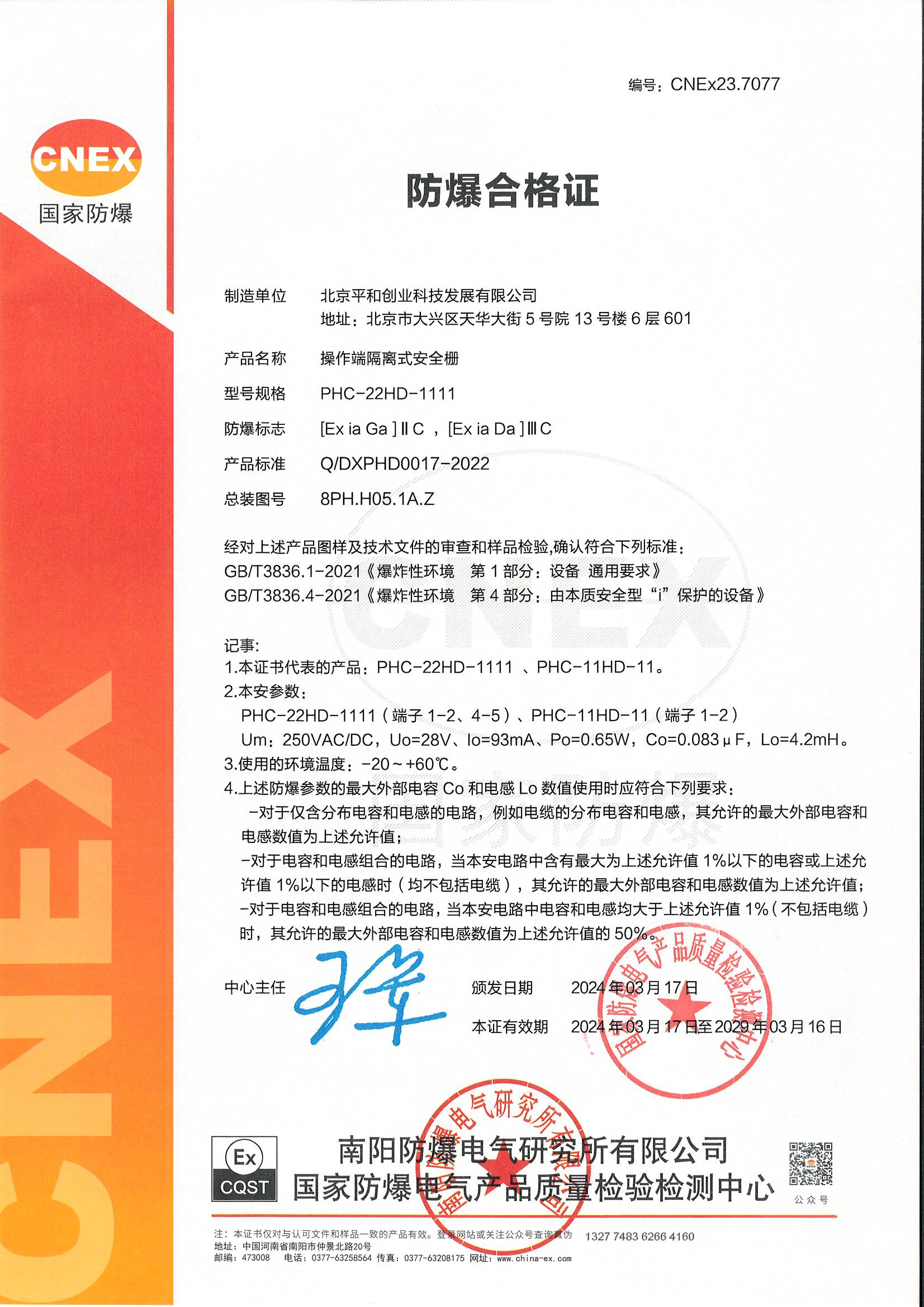 认证参数(端子3-4之间) Um=250V Uo=28V Io=93mA Co=0.05uF Lo=2.4mH Po=0.65W