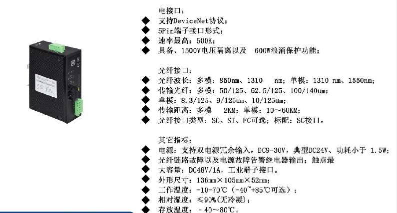 PH-D系列是一款工业级DeviceNet总线数据光端机,支持DeviceNet协议,速率支持最高500K,单光口/双光口链网支持。35mmDIN,DC9-30V电源.PH-D支持两路可级联上下行光纤接口,一路数据接口,PH-D支持一路光纤接口,一路数据接口。