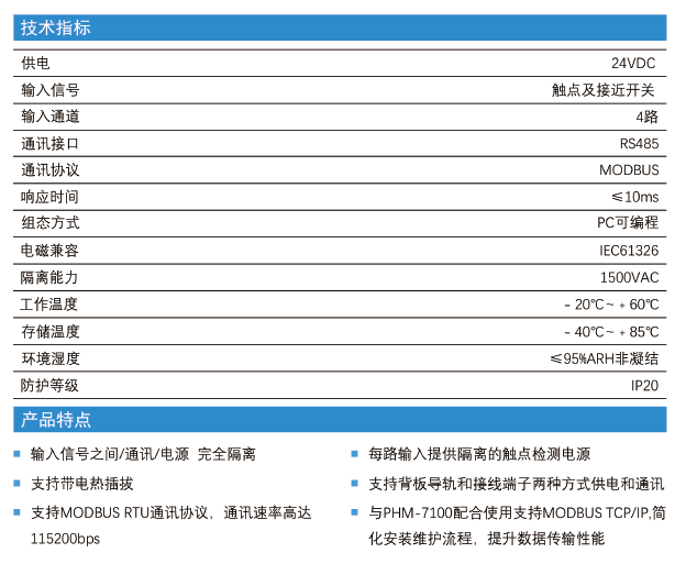 将工业现场的4路开关量分别隔离转换为数字信号,按照MODBUS规约,通过RS485通讯方式,将数字信号提供给PHM-7100,PLC或上位机等控制器或数据采集系统。完善的隔离设计理念非常适合工业现场的复杂工况,长期稳定性好,每路提供隔离的触点检测电源,增加了触点检测的可靠性、抗干扰性能优异。