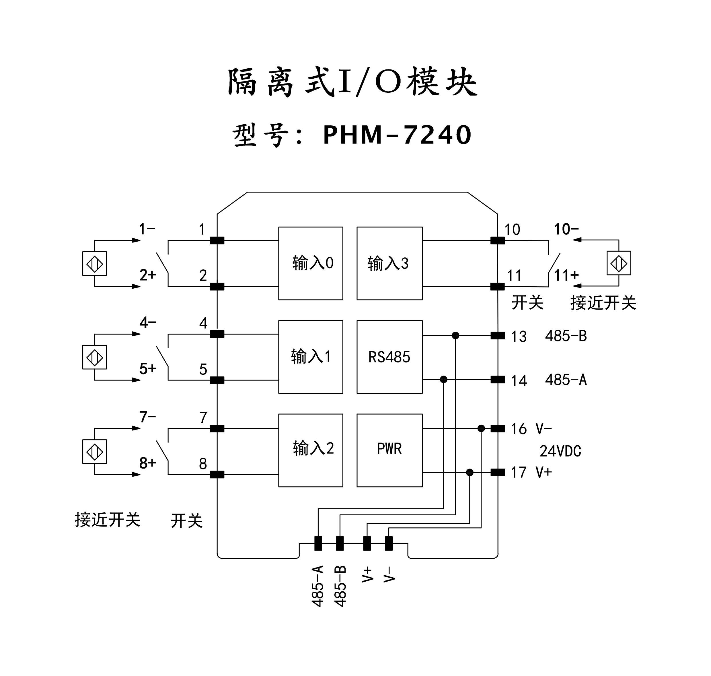 将工业现场的4路开关量分别隔离转换为数字信号,按照MODBUS 规约,通过RS485通讯方式, 将数字信号提供给PHM-7100,PLC或上位机等控制器或数据采集系统。完善的隔离设计理念非常适合工业现场的复杂工况,长期稳定性好,每路提供隔离的触点检测电源,增加了触点检测的可靠性、抗干扰性能优异。