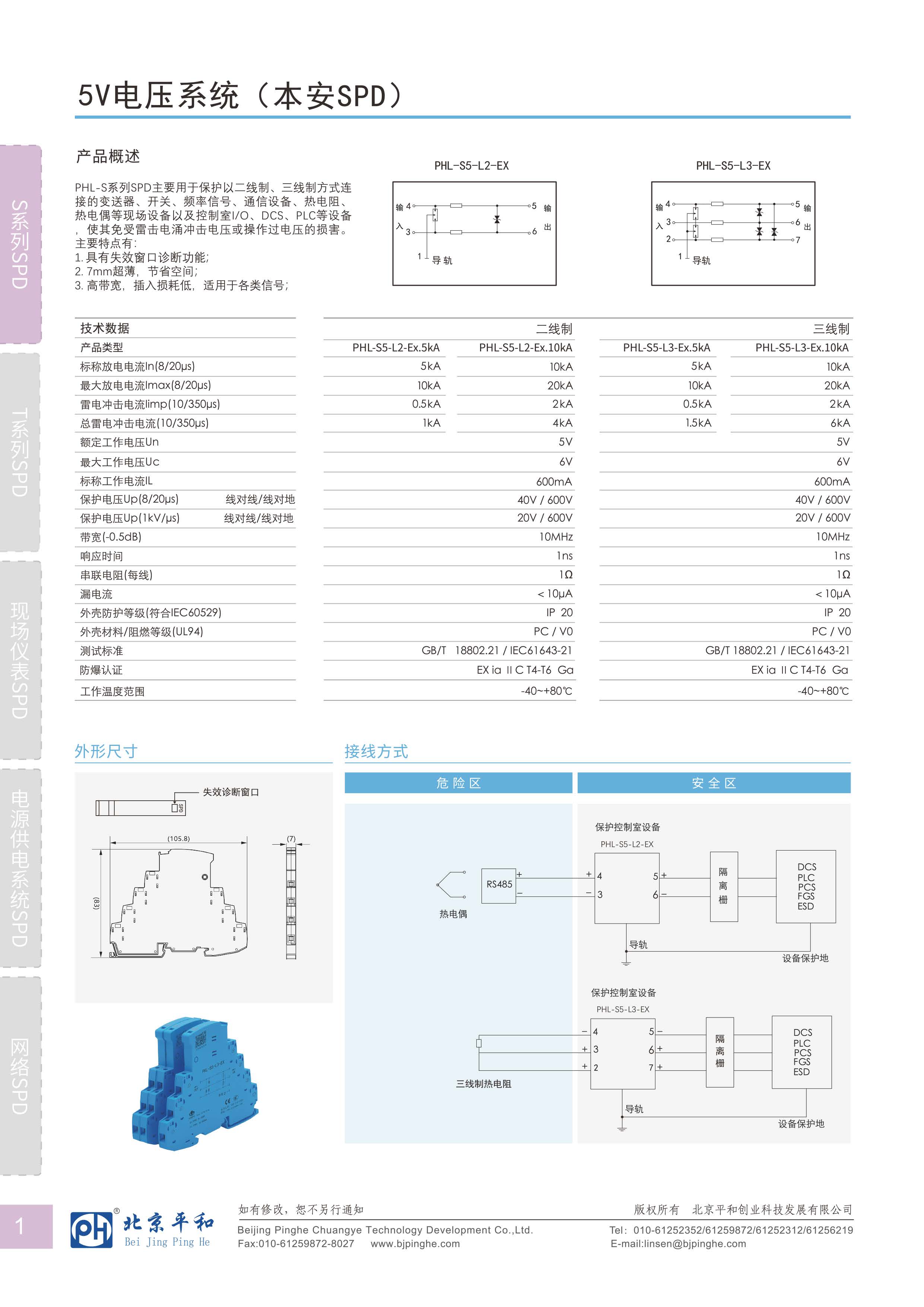 PHL-S系列SPD主要用于保护以二线制、三线制方式连接的变送器、开关、频率信号、通信设备、热电阻、热电偶等现场设备以及控制室I/O、DCS、PLC等设备,使其免受雷击电涌冲击电压或操作过电压的损害。主要特点有: