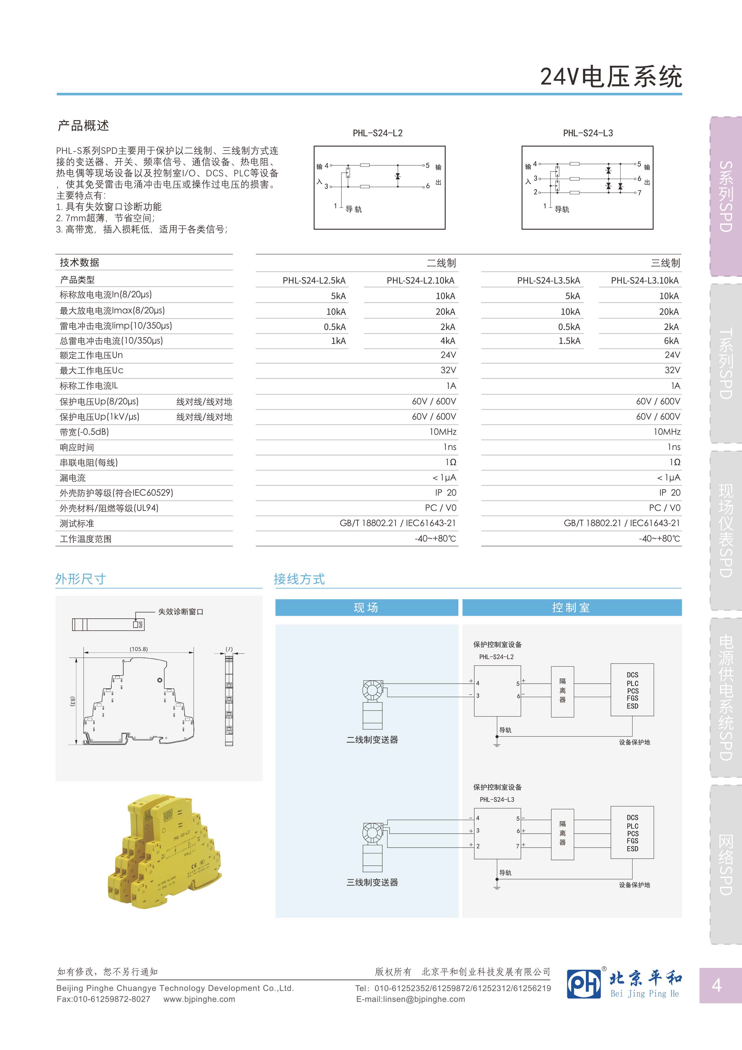 PHL-S系列SPD主要用于保护以二线制、三线制方式连接的变送器、开关、频率信号、通信设备、热电阻、热电偶等现场设备以及控制室I/O、DCS、PLC等设备,使其免受雷击电涌冲击电压或操作过电压的损害。主要特点有: 1.顶部具有状态报警显示功能; 2.7mm超薄,节省空间; 3.高带宽,插入损耗低,适用于各类信号;