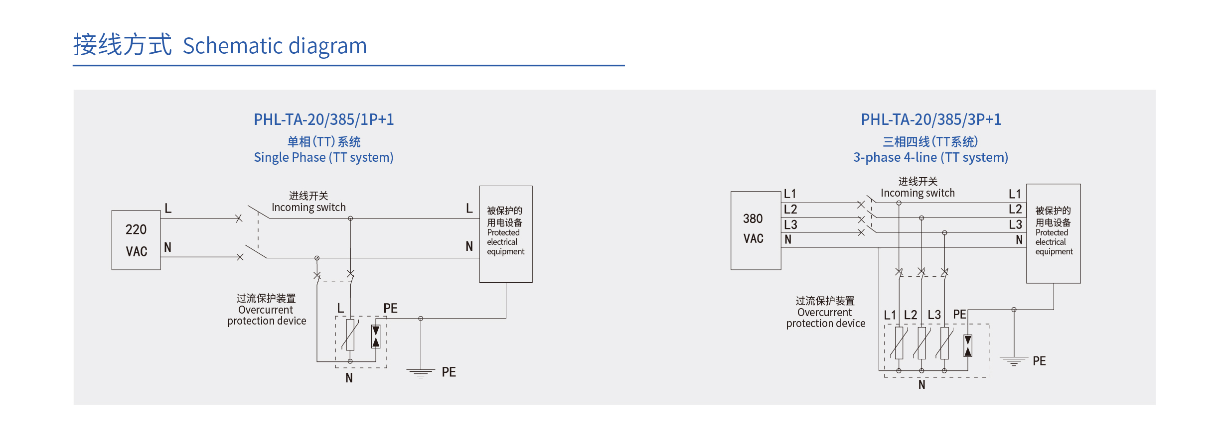 用于第三级的三相电源浪涌保护器,采用相线对零线,以及零线对地的共差模保护模式,适合安装在TT供电制式的分路配电柜,以及其他LPZ2区与LPZ3区和后续分区的交界处。
