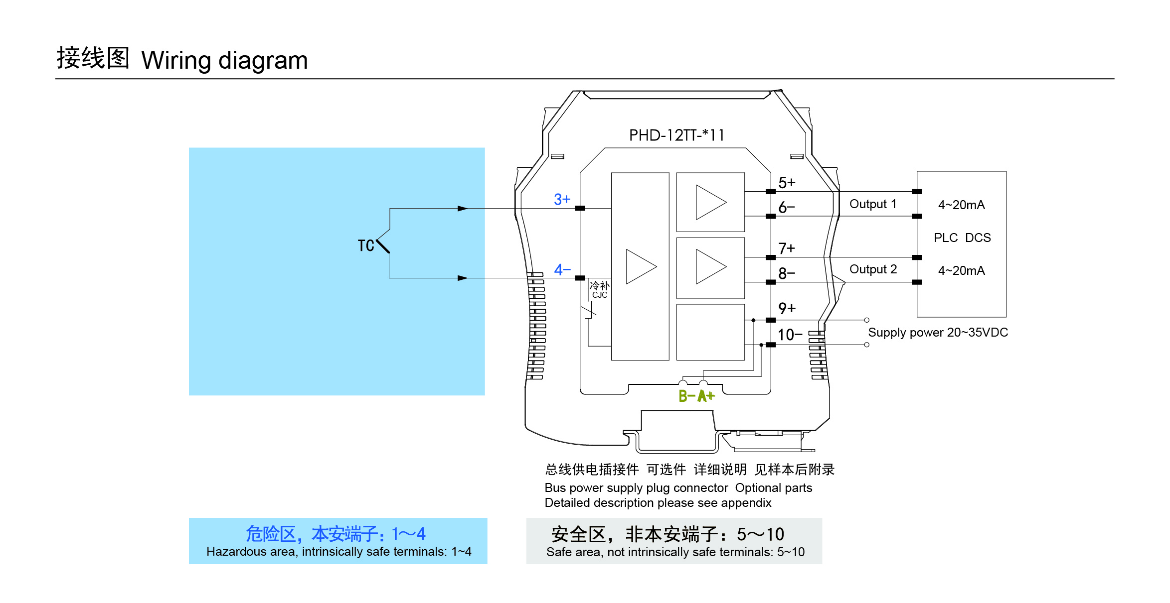 供电电压 20-35VDC,功耗<1.8W (24VDC供电,20mA输出时)