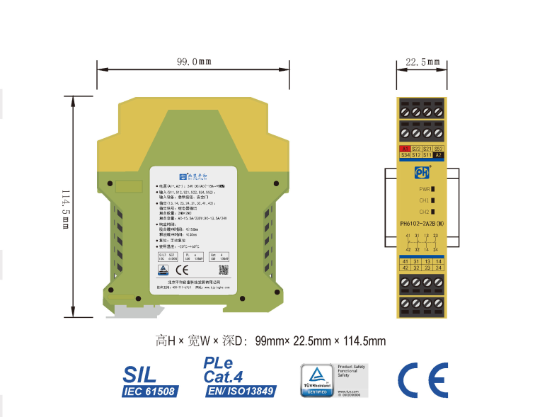 PH6102-2A2B(M)是一款安全继电器控制模块,适用于急停按钮、安全门控制开关输入,具有2路常开(NO)安全输出触点和2路常闭(NC)辅助输出触点的安全继电器。它支持单、双通道操作,手动复位,并具有通道间短路监控功能。
