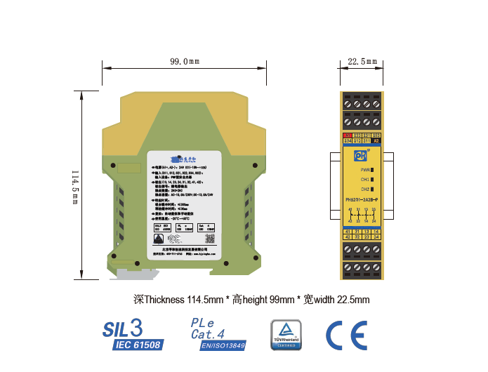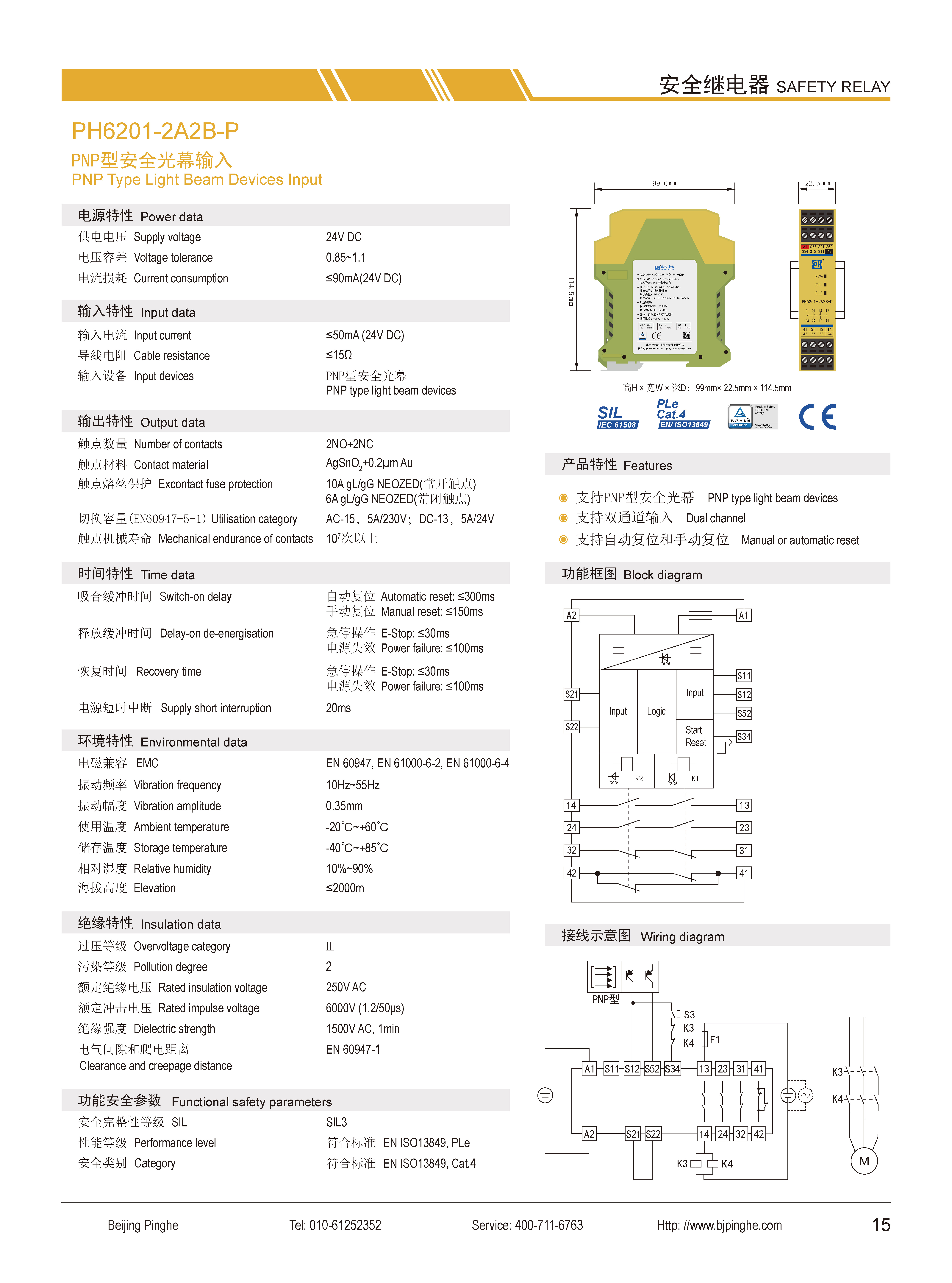 PH6201-2A2B-P是一款安全继电器控制模块,适用于PNP型安全光幕输入,具有2路常开(NO)安全输出触点和2路常闭(NC)辅助输出触点的安全继电器。它支持单、双通道操作,手动或自动复位,并具有通道间短路监控功能。