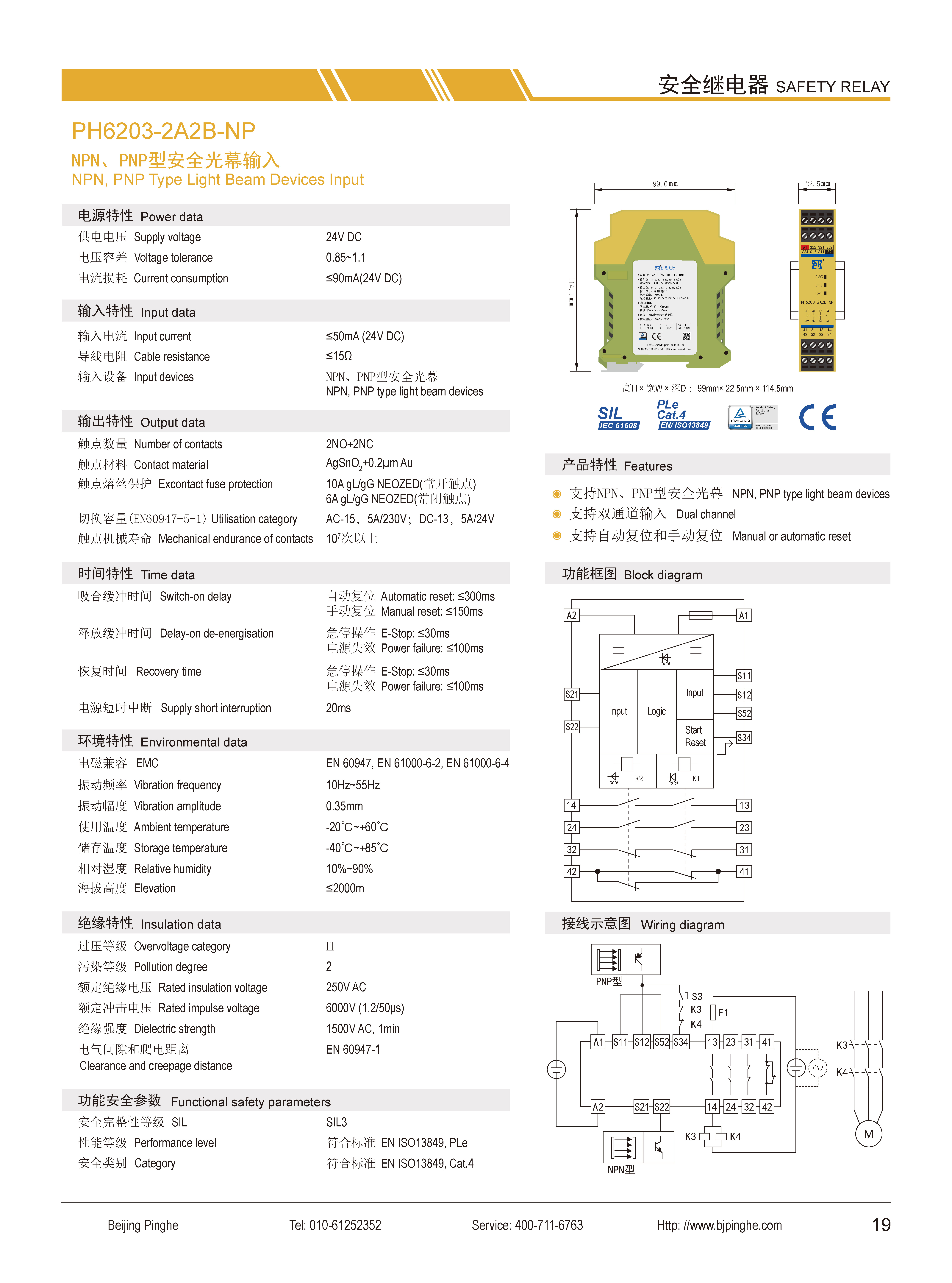 PH6203-2A2B-NP是一款安全继电器控制模块,适用于NPN、PNP型安全光幕输入,具有2路常开(NO)安全输出触点和2路常闭(NC)辅助输出触点的安全继电器。它支持双通道操作,可选择手动或自动复位。