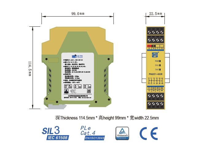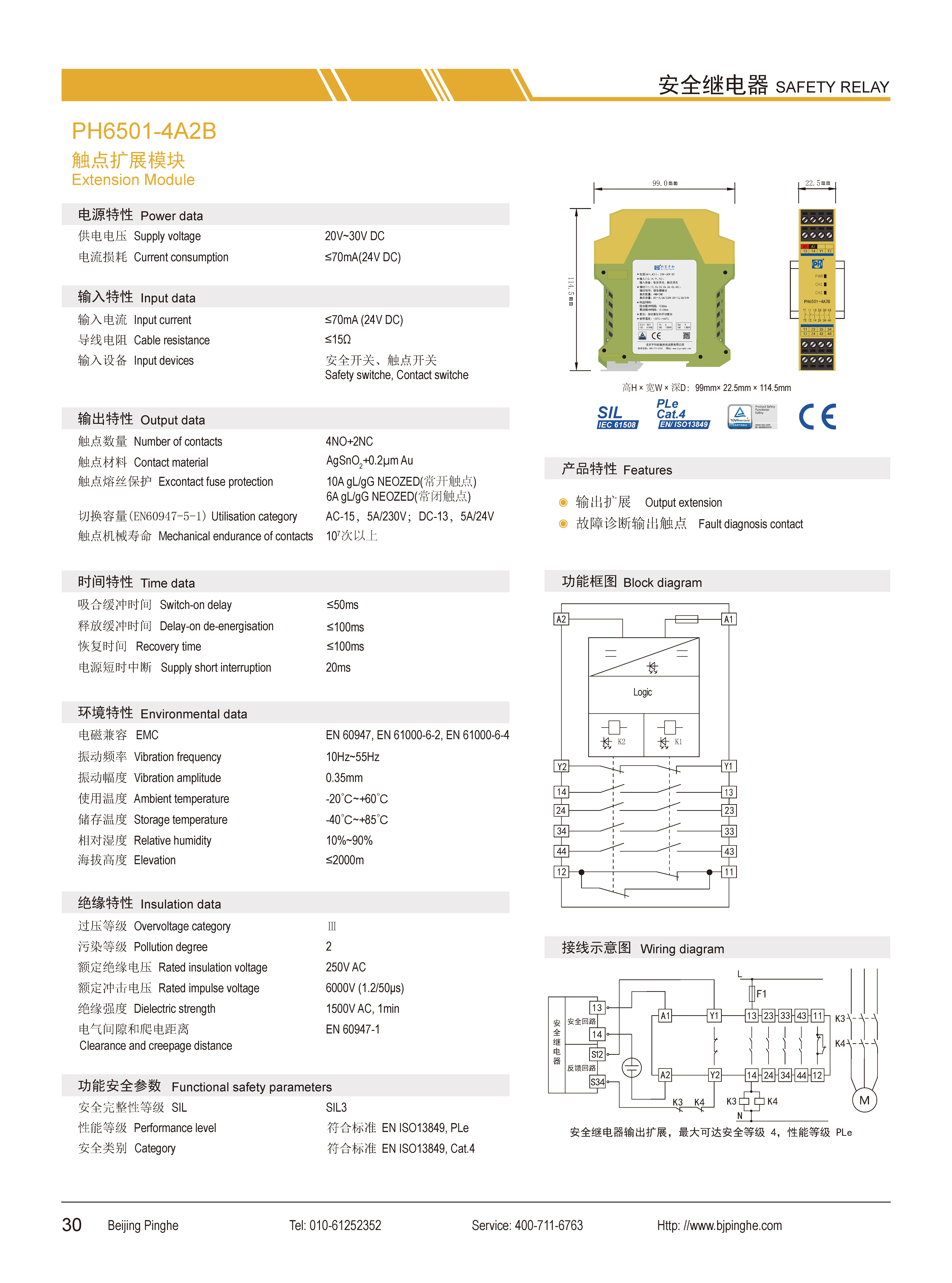PH6501-4A2B是一款安全继电器输出扩展模块,它接收现场的安全开关信号,并扩展为4路常开(NO)安全输出触点和2路常闭(NC)辅助输出触点,2路辅助触点可分别用于输出状态指示及故障反馈。