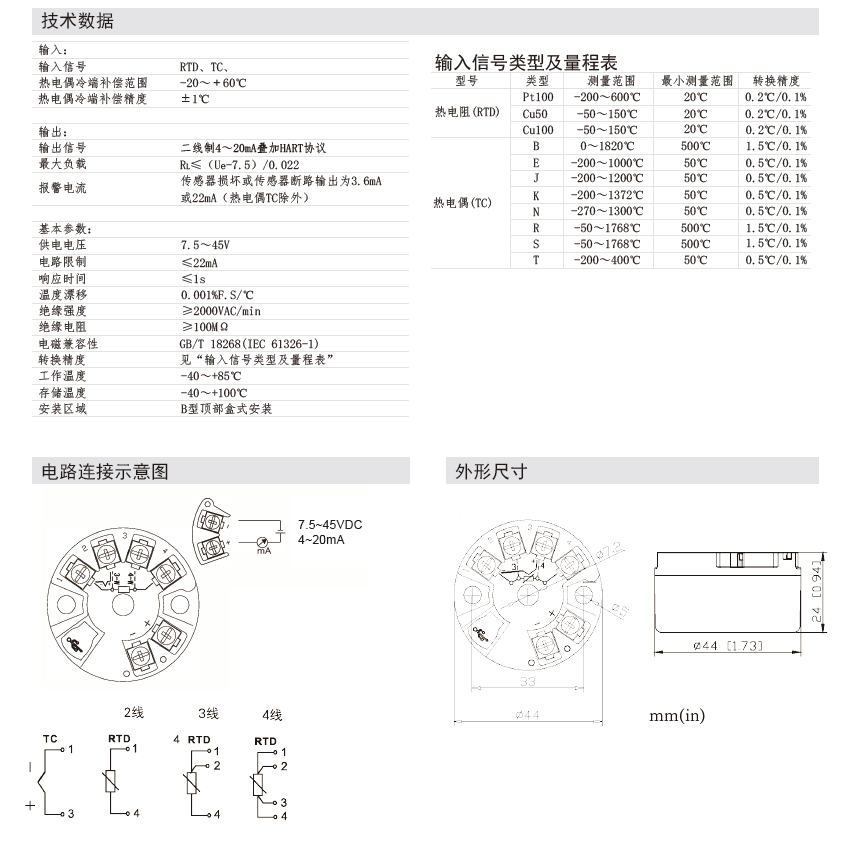 PH智能温度变送器,用于热电阻(RTD)、热电偶(TC),二线制4~20mA模拟输出,安装于传感器内部(Form B)。