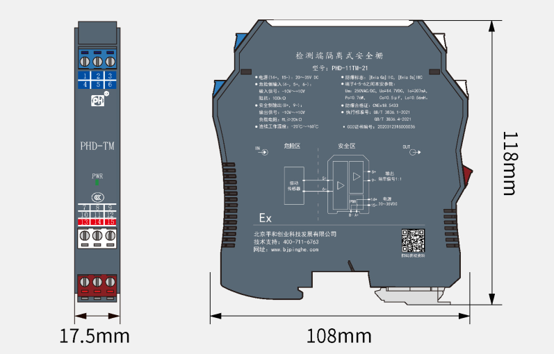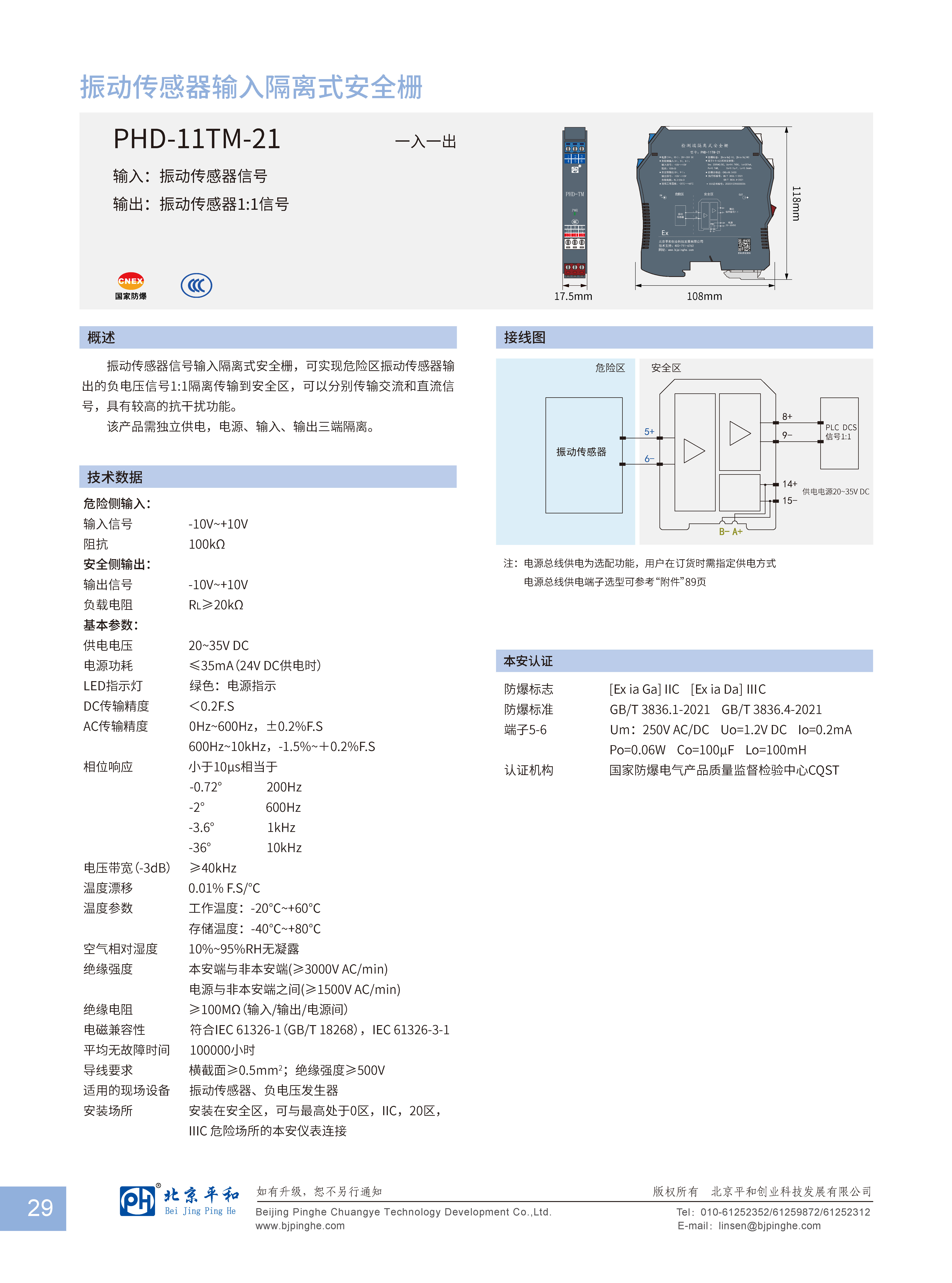 振动传感器信号输入隔离式安全栅,可实现危险区振动传感器输出的负电压信号1:1隔离传输到安全区,可以分别传输交流和直流信号,具有较高的抗干扰功能。