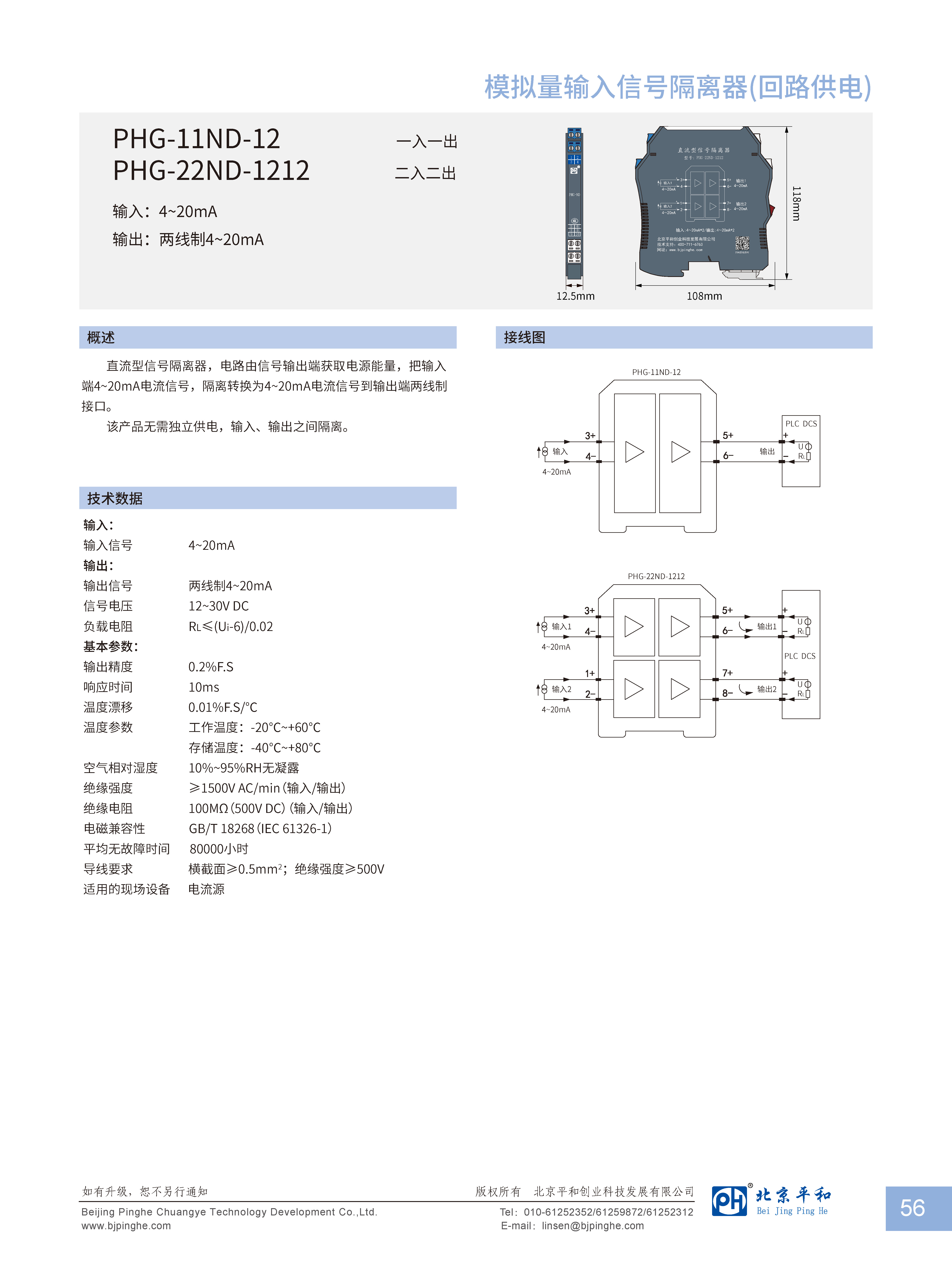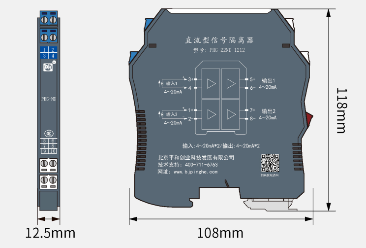 直流型信号隔离器, 电路由信号输出端获取电源能量, 把输入端4~20mA电流信号,隔离转换为4~20mA电流信号到输出端两线制接口。