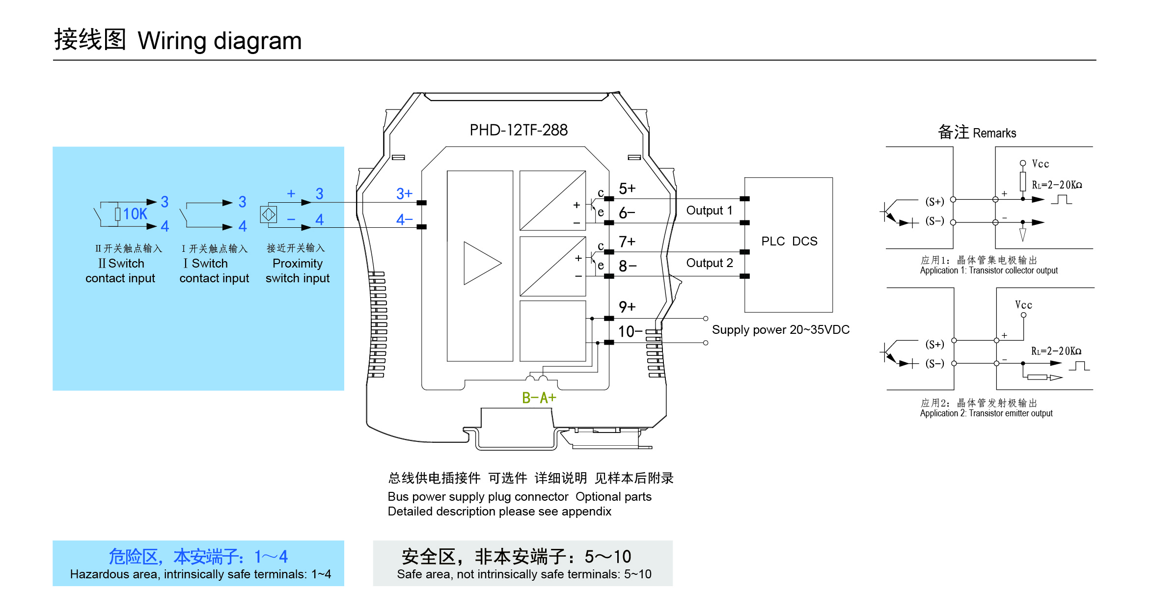 | 指示灯报警功能 | 现场输入电流>7mA,短路报警(SC),现场输入电流<0.1mA,开路报警(LB)开关触点输入,需断线检测功能时,须在开关两端并联10KΩ电阻(如下图接线图中开关触点Ⅱ) |