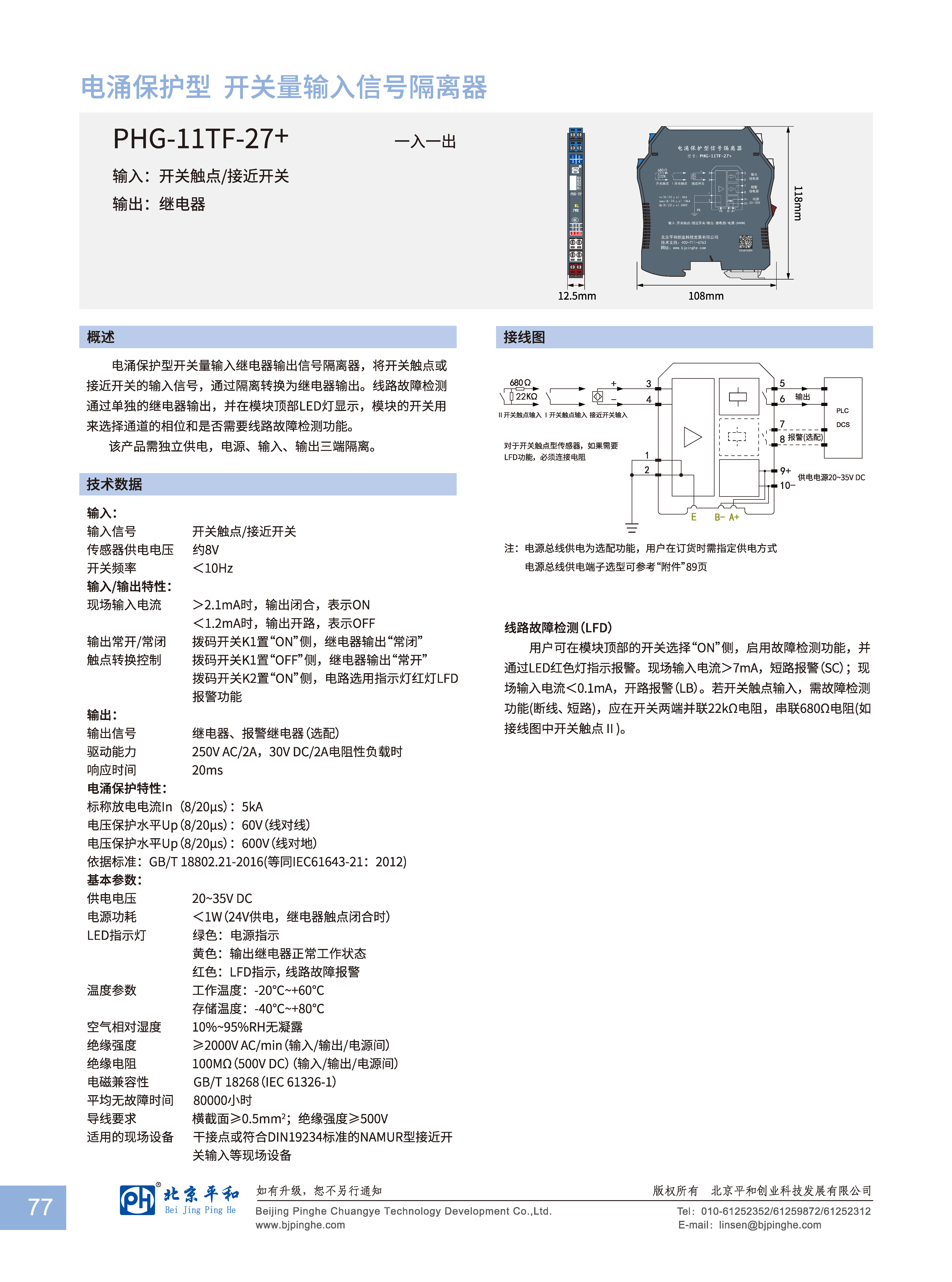 电涌保护型开关量输入继电器输出信号隔离器,将开关触点或接近开关的输入信号,通过隔离转换为继电器输出。线路故障检测通过单独的继电器输出,并在模块顶部LED灯显示,模块的开关用来选择通道的相位和是否需要线路故障检测功能。